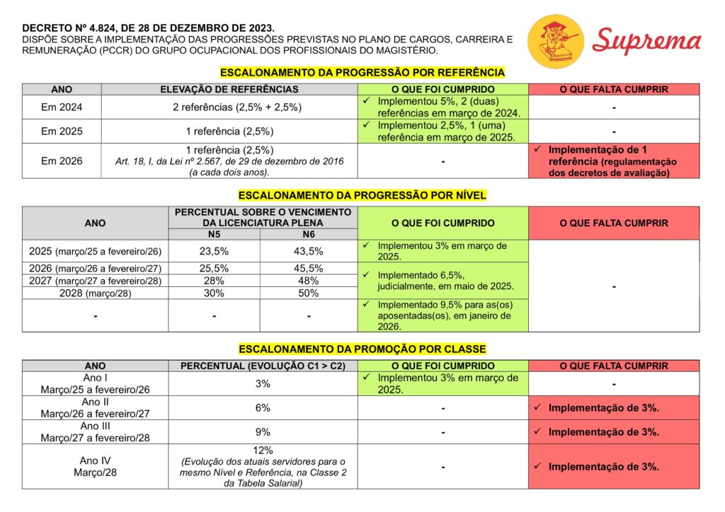 No que diz respeito à progressão por referência, o escalonamento previsto começou a sair do papel. Em 2024, foram implementadas duas referências, totalizando 5% de reajuste, aplicadas em março daquele ano. Já em 2025, foi efetivada mais uma referência, correspondente a 2,5%, também em março. Para 2026, aguardamos a implementação de mais uma referência, conforme determina o artigo 18, inciso I, da Lei nº 2.567/2016, que prevê a progressão a cada dois anos. O SUPREMA segue cobrando a regulamentação dos decretos de avaliação para garantir esse direito.